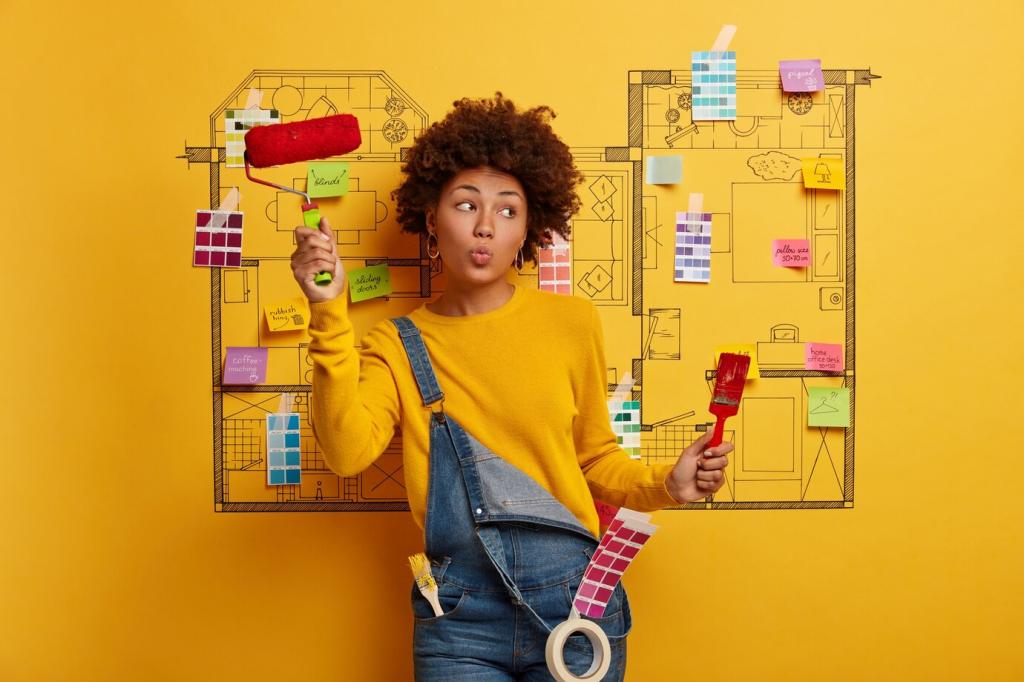 Wähle zwei Haupttöne und einen Akzent, um Streuverluste zu vermeiden. Restposten aus dem Baumarkt können echte Schnäppchen sein. Verrate deine Lieblingspalette, und wir schicken dir drei günstige Musterkombinationen zum Ausprobieren.